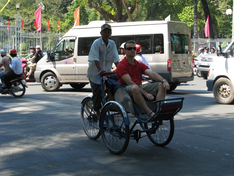My jsme v Ho Chi Minh chodili pěšky, protože všechny památky a významná místa byly v blízkosti hotelu. Nebo jsme jeli taxi, která jsou ve Vietnamu téměř zadarmo. Vzdálenost 2,8 km stála podle taxametru pouhých 35 800 VND (asi 35,8 Kč)! Další možností je využít služeb řidičů rikš, kterých je v Saigonu dostatek. O ceně jízdného se smlouvá, ale kolik chtějí nevím, protože jsem s nimi nejel.